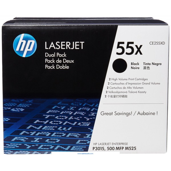 Pack de tóner CE255XD original HP 55X, contiene dos unidades de HP CE255X negro,es válido para las siguientes impresoras e impresoras multifunción: